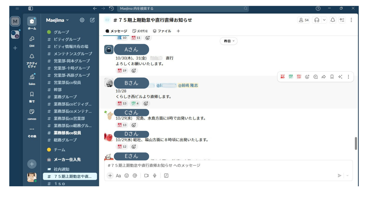 現在、部署内での情報共有や直行直帰の連絡、有休休暇申請、営業車利用前のアルコールチェックの記録などが進んでいる。また、検索機能が優れており、キーワードだけで他の社員の発信を簡単に見つけ出せるので、とくに若い社員の感覚にマッチしてるとのことだ。